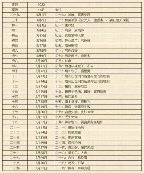 藏历理发吉凶对照表通常会详细列出每一天的吉凶状态,帮助人们选择最有利的时机进行理发。这个对照表不仅仅考虑了日子的吉凶,还结合了个体的生肖、出生年份等因素,使得其具有个性化的指导意义。例如,某些日子被认为是适合进行重要决策和行为的“吉日”,而其他日子则可能被视为不宜进行任何重大活动的“凶日”。