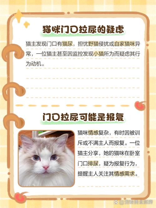 我们需要了解猫咪撒尿的生物学原因。猫咪是 territorial animals(有领土意识的动物),它们通过尿液标记自己的领地。撒尿不仅是生理需求的体现,也是一种社交行为。在门口撒尿,往往意味着猫咪在宣示自己的领地,警告其他动物不进入它所认为的“安全区”。