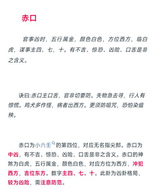 在古代命理学和风水学中,“赤口”作为一个关键术语,被赋予了深刻的吉凶意义。这个概念源自中国传统的八字命理系统,它不仅关乎...