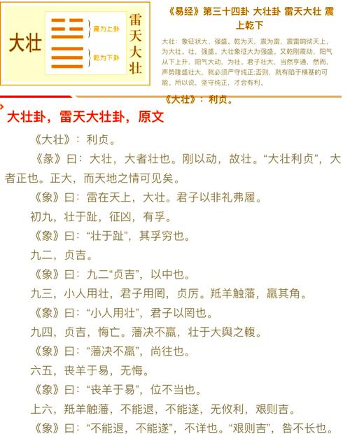 大壮卦在《周易》六十四卦中位列第34卦,卦形为乾下震上,象征着威严壮盛,气势磅礴。卦象上震下乾:震为雷、为动;乾为天、为刚...