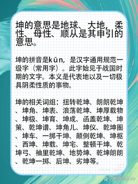 坤字在取名中的吉凶解释涉及多个方面,包括其寓意、五行属性以及与名字搭配的禁忌等。以下是对坤字取名的详细解释。宽广的胸怀坤...