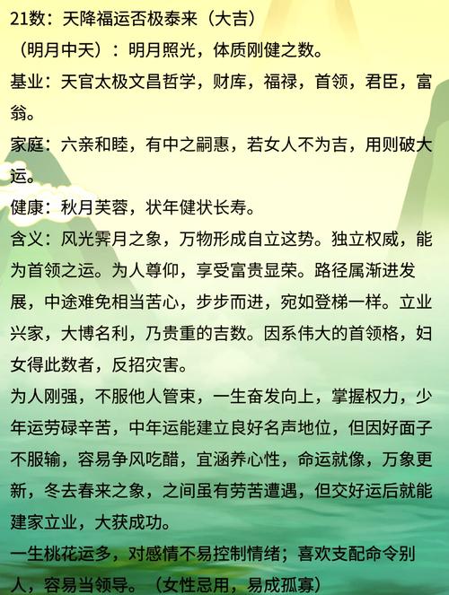 在中国传统文化中,名字的数字吉凶口诀是一个神秘而又引人入胜的话题。它不仅涉及到命理学的深奥智慧,还结合了姓名学的复杂理论...