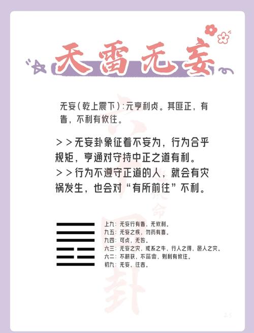卦意概述:天雷无妄卦,上卦为乾,阳刚;下卦为震,震动。卦象寓意光明正大,行动果断,无妄之灾。吉凶解析:吉兆:行动顺利:卦...
