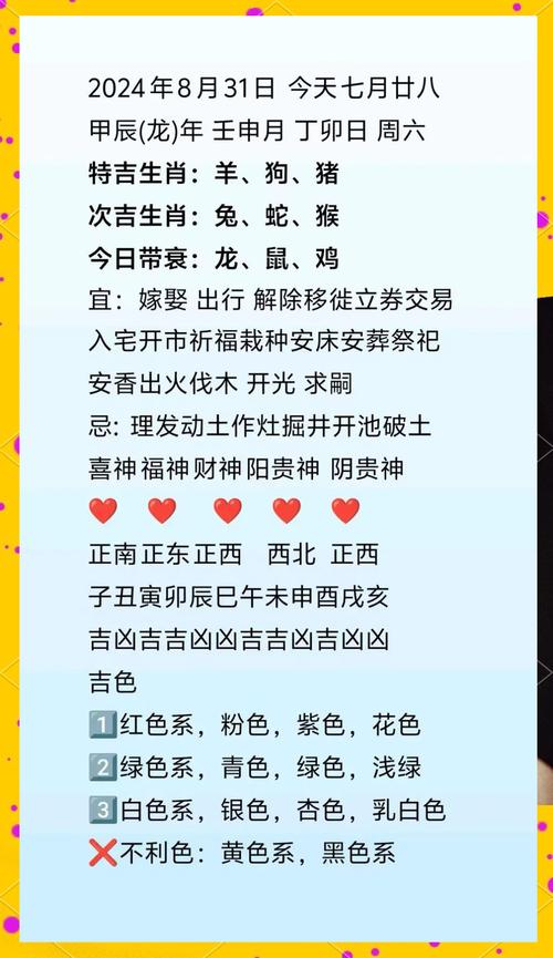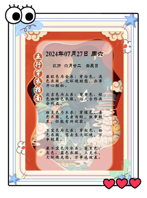 根据周易和五行理论,2024年7月27日的穿衣吉凶可以通过五行属性来判断。以下是详细的穿衣指南和运势分析。吉利颜色白色系列:包括...