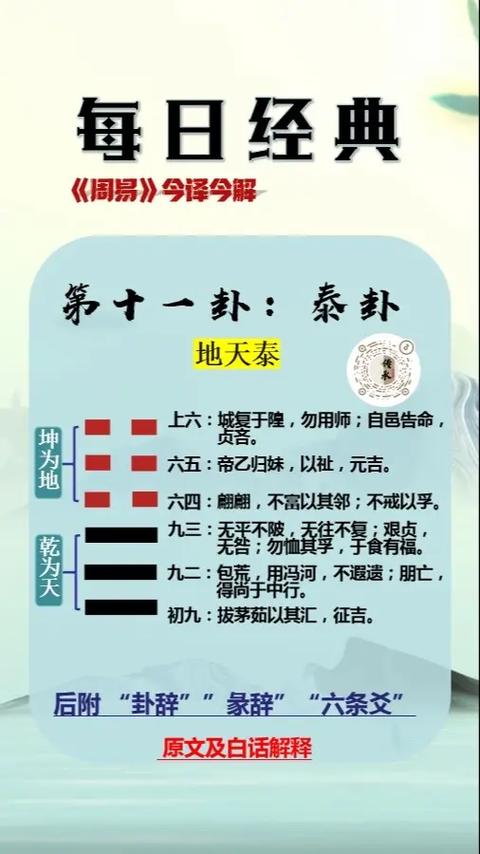 在《易经》中,第十一卦为“泰卦”,其象征意义深远,涵盖了和谐、安宁和顺利的主题。这一卦象的形成来源于上卦“地”和下卦“天...