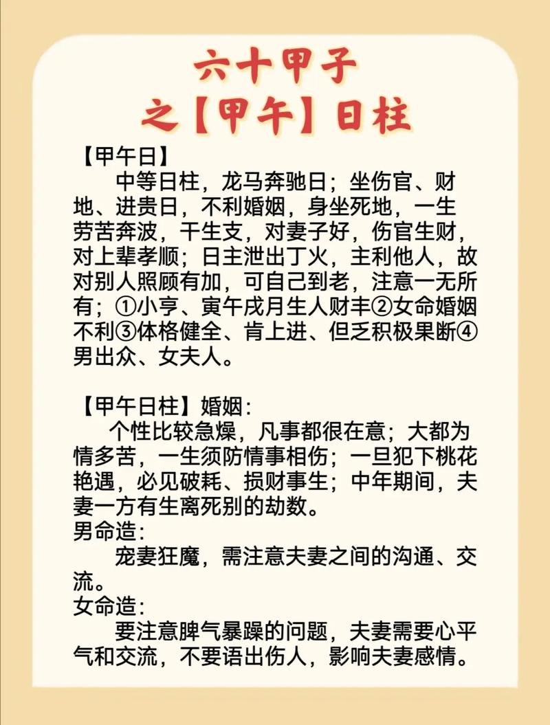 甲午日柱,乃天干“甲”与地支“午”相组合而成,在六十甲子中排行第21位。甲午日出生之人,五行属木火,其性格刚毅果断,做事雷...